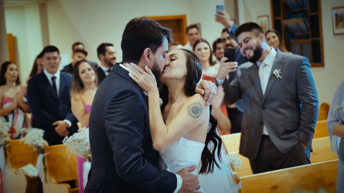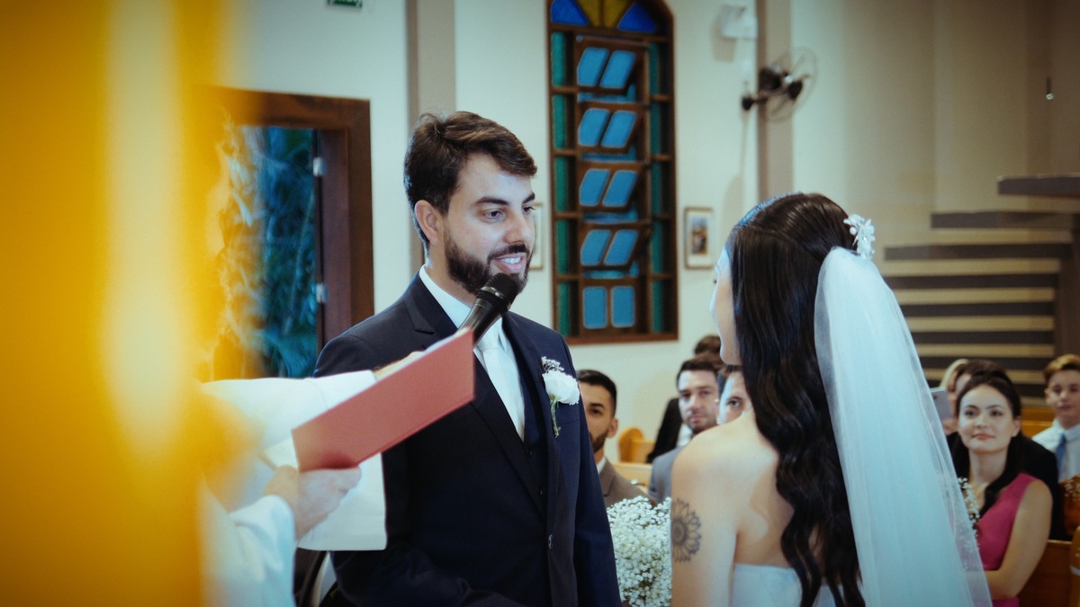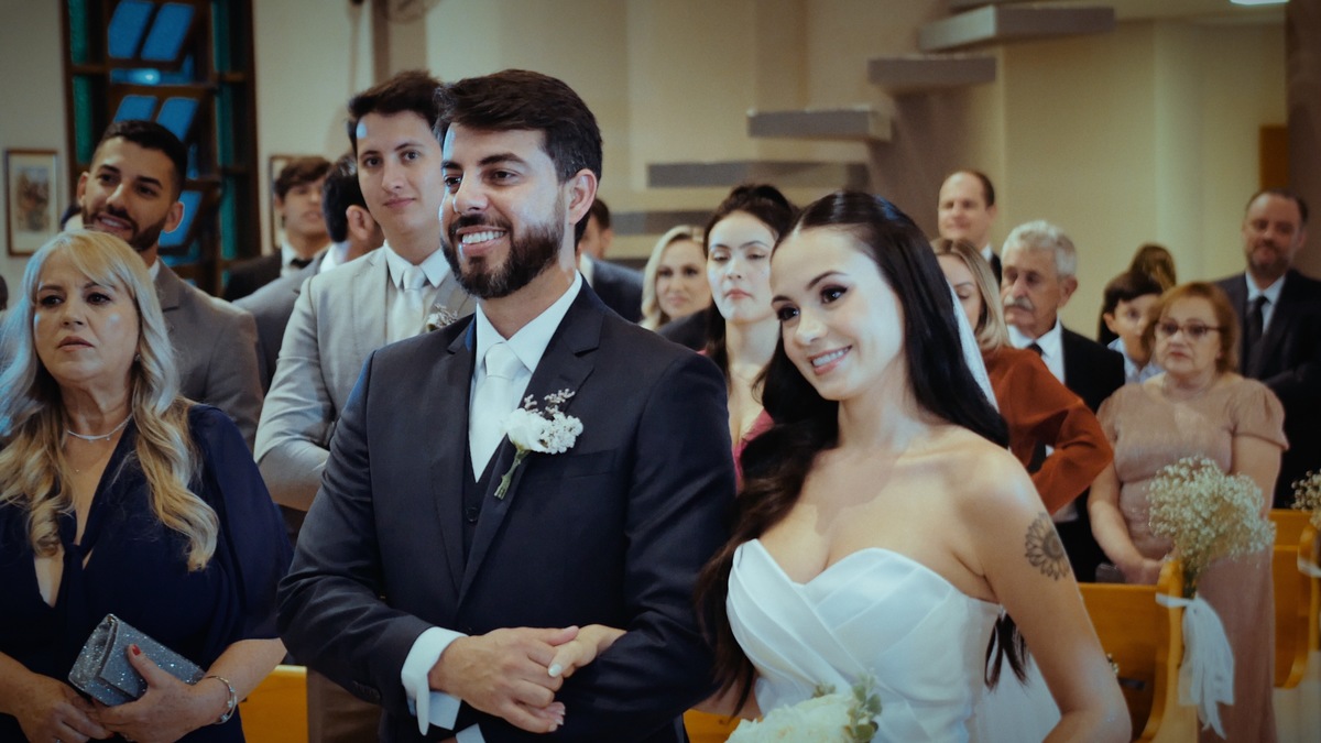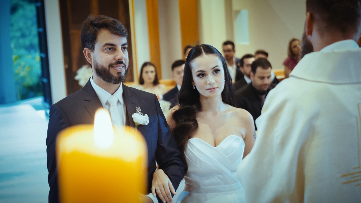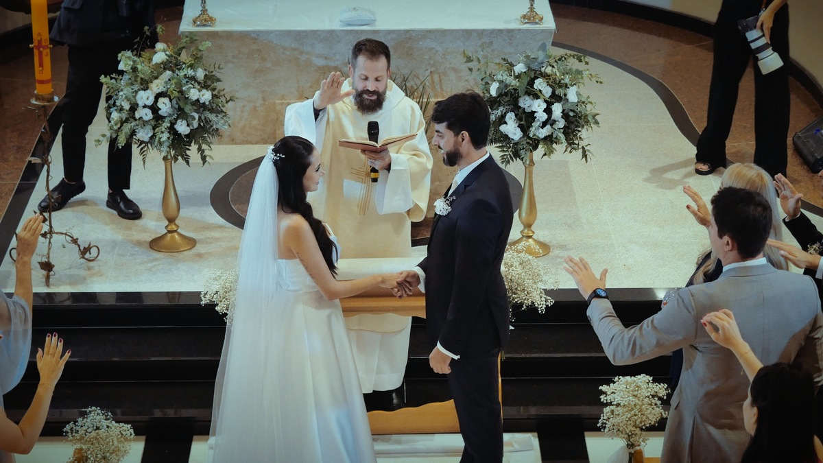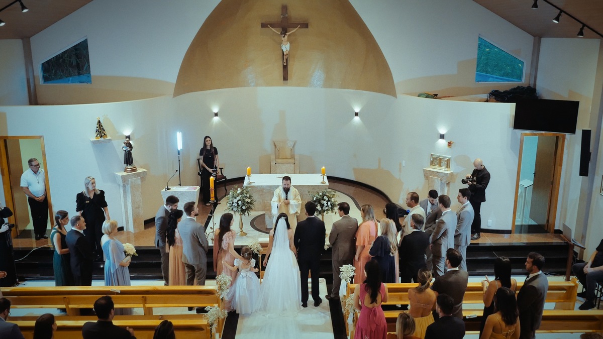 Um casamento tradicional realizado em igreja católica e no final o padre convida todos os padrinhos para subir no altar e deixar uma mensagem para todos.