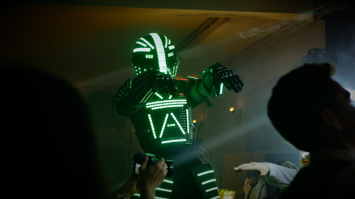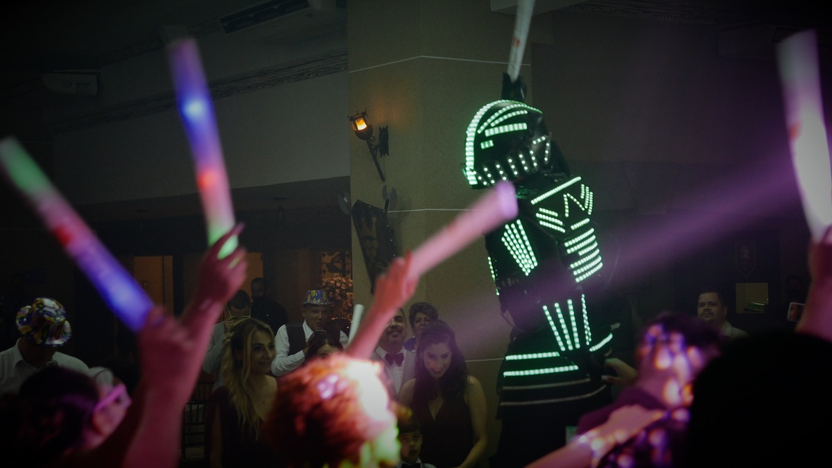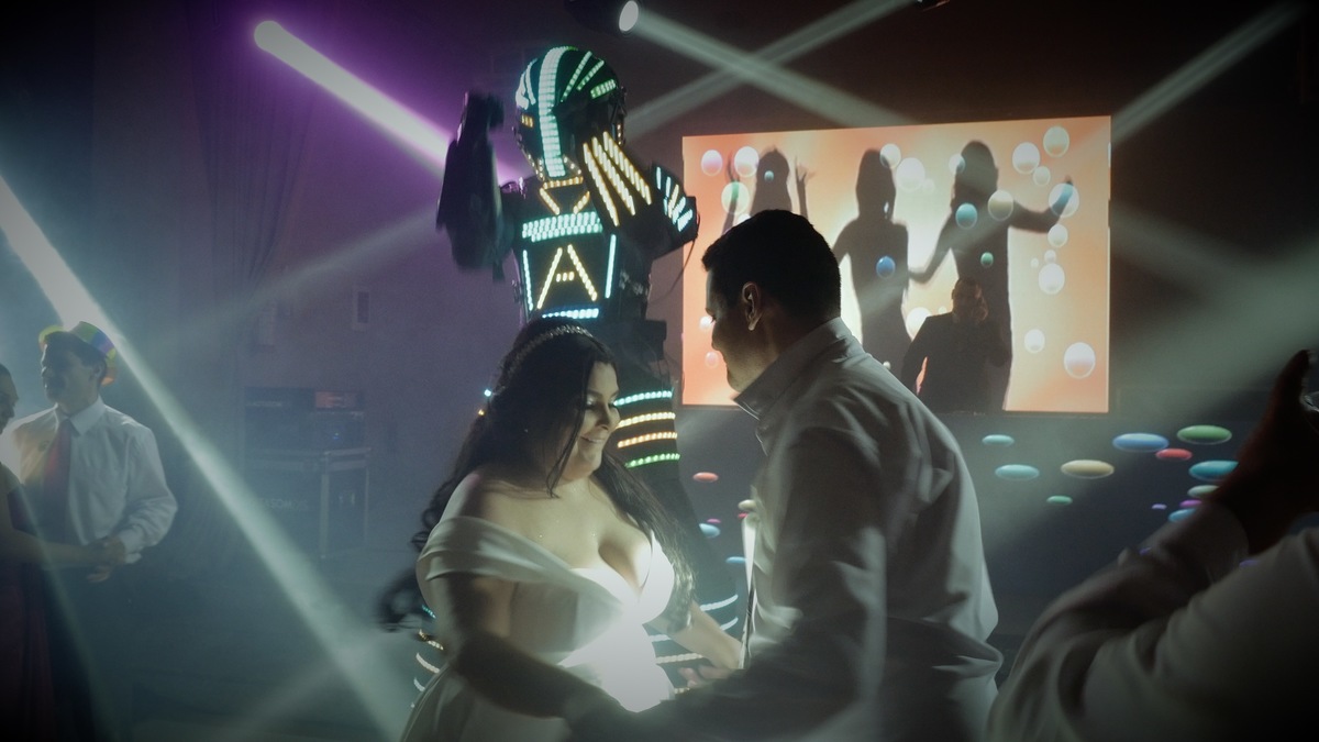 Para finalizar a balada do casamento contou com um robô gigante todo iluminado agitando a festa com suas fumaças e leds espalhado no corpo.