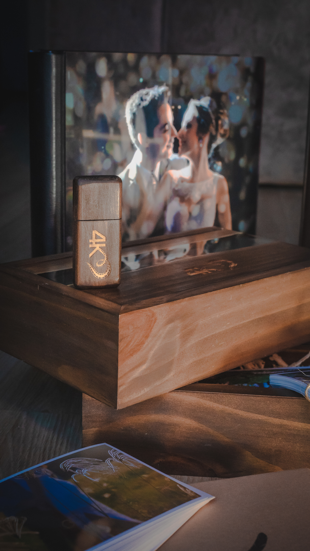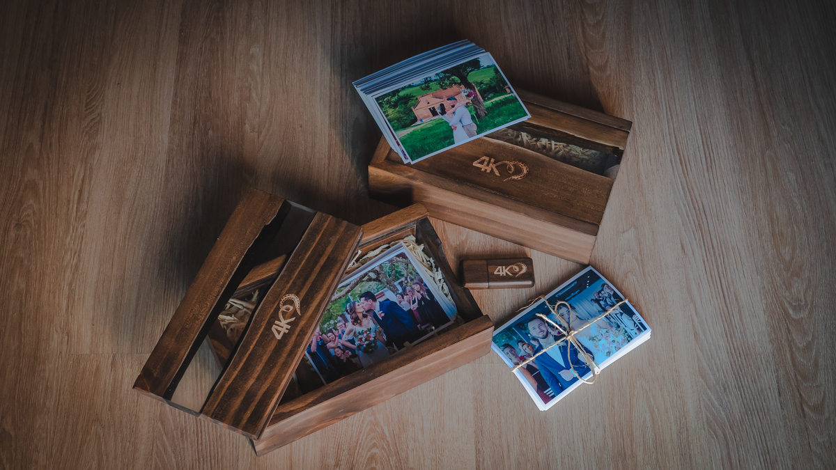 Para isso produzimos uma caixinha em madeira com detalhe em vidro para que você nosso cliente possa guardar o vídeo do seu casamento num pendrive personalizado feito em madeira e nessa caixa contém algumas fotografias que extraímos do vídeo.